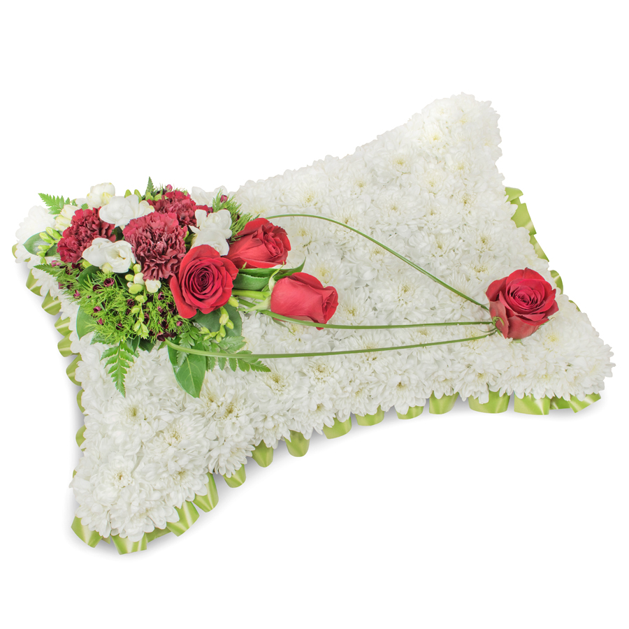 Convey your deepest sympathies with our sophisticated sympathy arrangement, artfully composed of white chrysanthemums, red roses, white freesias, and dark red carnations. Enhanced with dianthus and elegant bear grass, this bouquet exudes both grace and beauty.